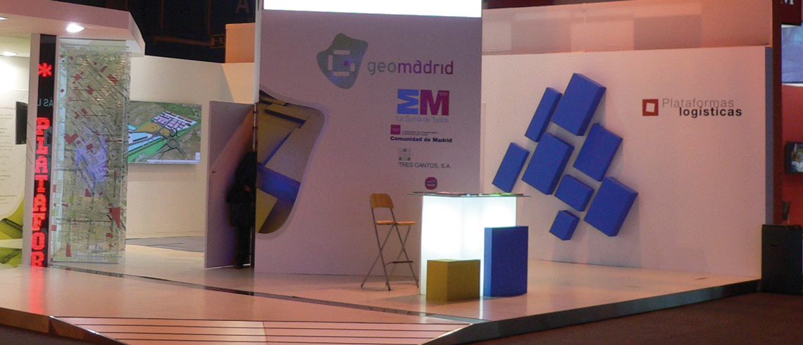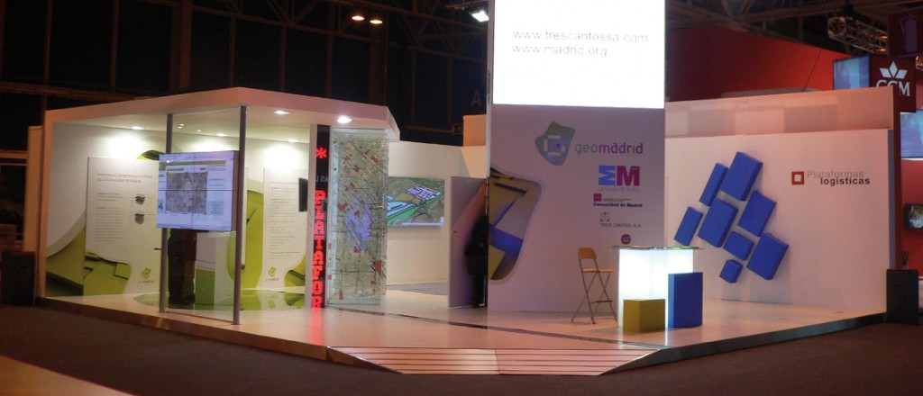 Diseño y realización integral del stand de Geomadrid para la Feria Sein. Primeras utilizaciones de pantallas de led y rótulos de texto contínuo de grandes dimensiones.